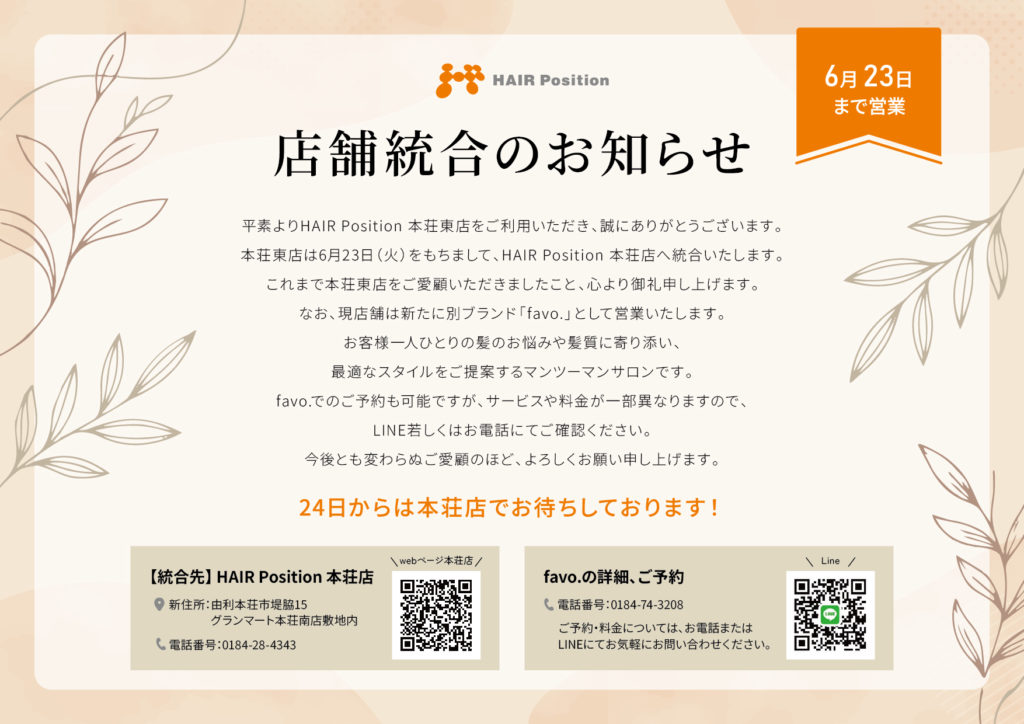 【HAIR Position本荘東】店舗統合のお知らせ